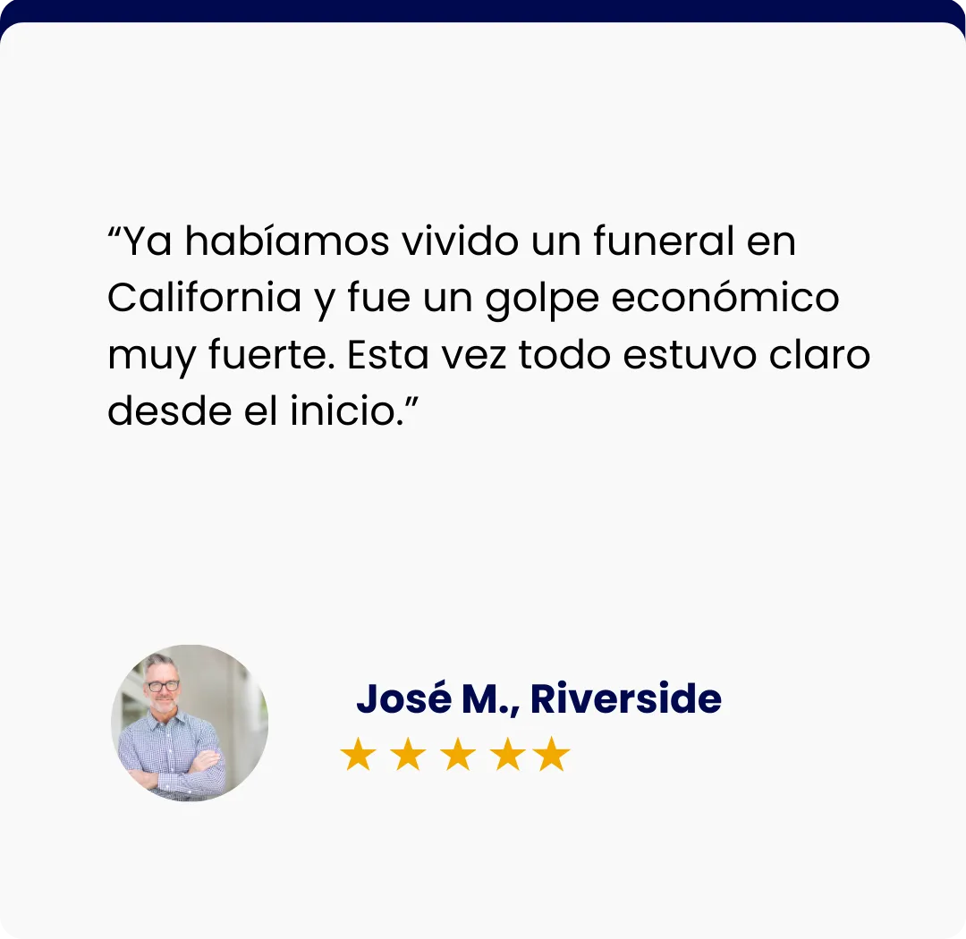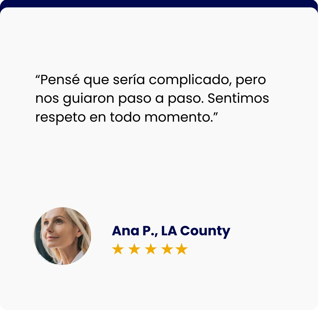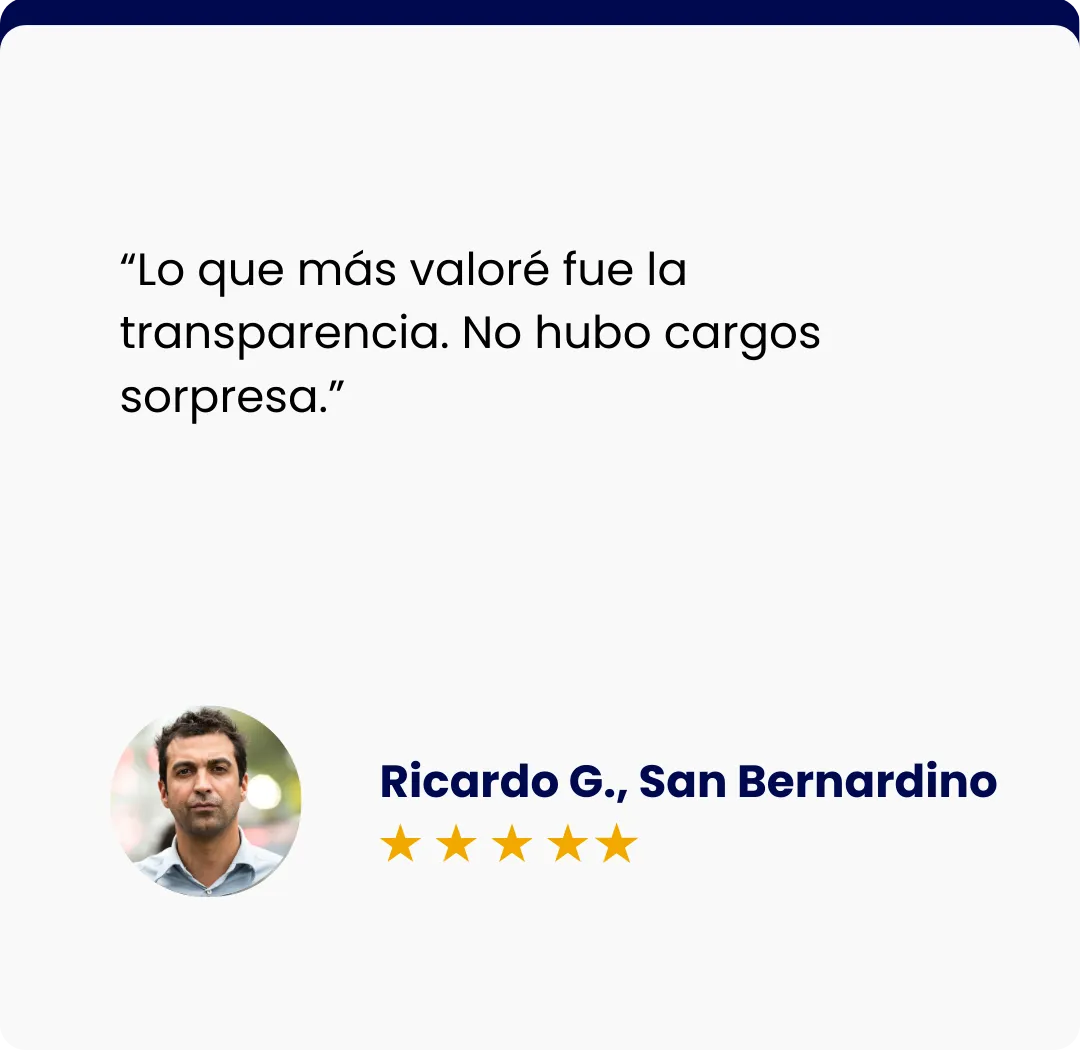 Ofrecemos cobertura en distintas zonas de California, incluyendo LA County, Riverside, San Bernardino, Orange County y áreas cercanas. En la asesoría confirmamos disponibilidad específica y alcance de traslado según su ubicación.